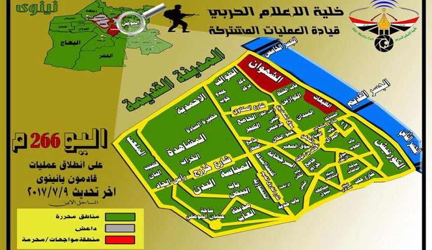 وبدت الخريطة الجديدة خالية من اللون الرمادي الذي يمثل تنظيم "داعش" الارهابي، في حين يطغي اللون الأخضر الذي يشير إلى المناطق المحررة من قبضة التنظيم، على معظم أجزائها.