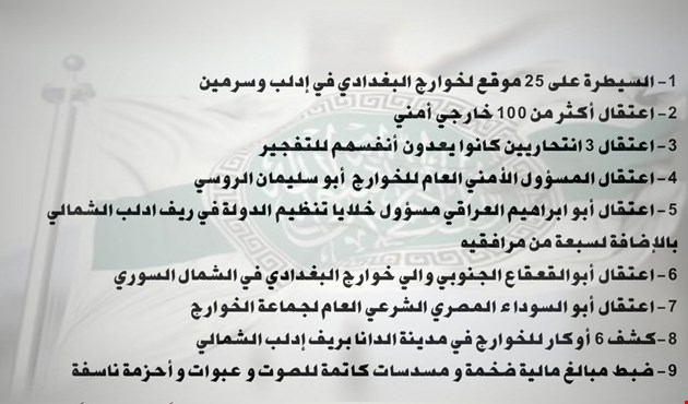 وجاء في البيان أنه تمت السيطرة على 25 موقعاً للتنظيم في إدلب وسرمين، واعتقال العشرات من بينهم قادة كبار من بينهم المسؤول الأمني في التنظيم أبو سليمان الروسي، وأبو إبراهيم العراقي مسؤول خلايا داعش بريف إدلب، وأبو القعقاع الجنوبي "والي داعش" في شمال سوريا، إضافة إلى أبو السوداء المصري "الشرعي العام" للتنظيم في سوريا.