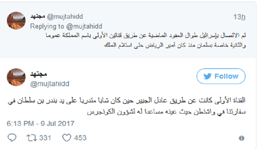 وفي التفاصيل التي نشرها مجتهد ضمن سلسلة تغريدات رصدتها "وطن" على موقع التواصل الاجتماعي "تويتر", قال المغرد الشهير.. "القناة الأولى كانت عن طريق عادل الجبير (وزير الخارجية السعودي الحالي) حين كان شابا متدربا على يد بندر بن سلطان في سفارتنا في واشنطن حيث عينه مساعدا له لشؤون الكونجرس ".