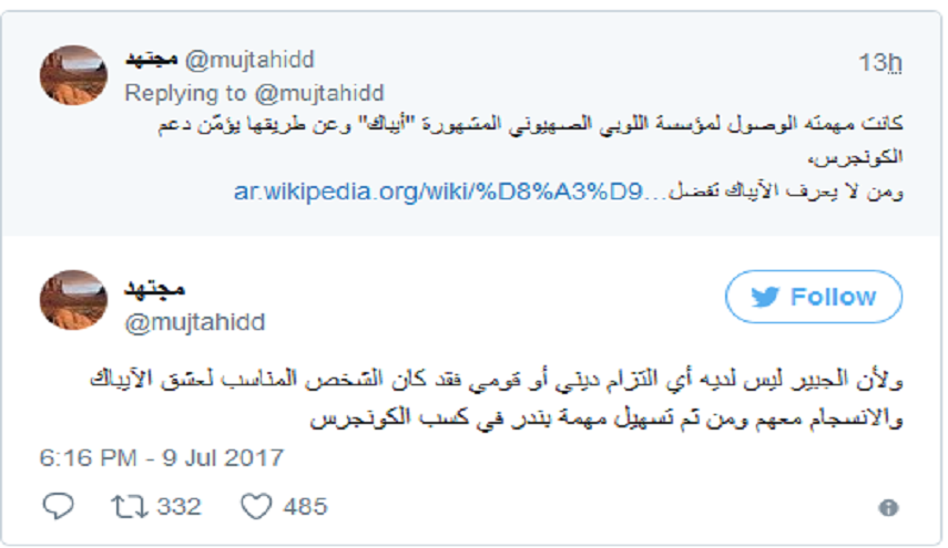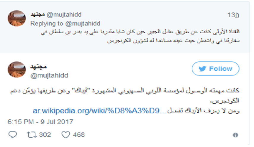 وأشار مجتهد إلى أن مهمة الجبير كانت الوصول لمؤسسة اللوبي الصهيوني المشهورة “أيباك” وعن طريقها يؤمّن دعم الكونجرس”, مرفقا تغريدته برابط للتعريف بـ”الآيباك”.