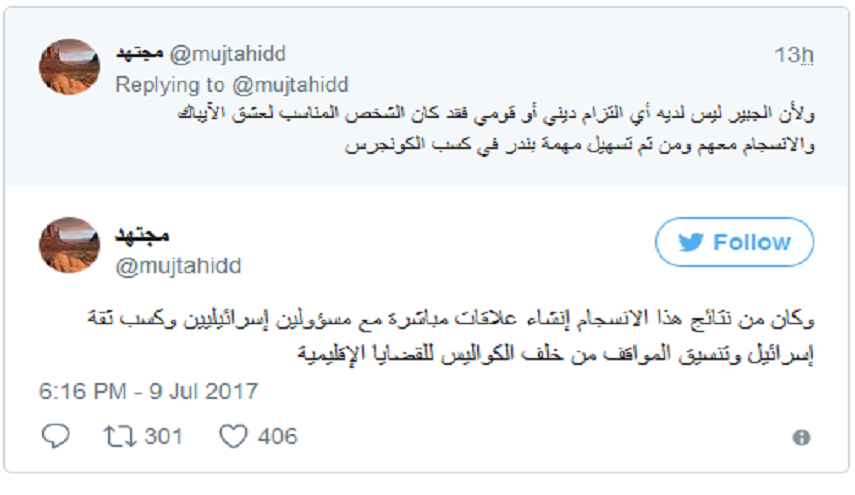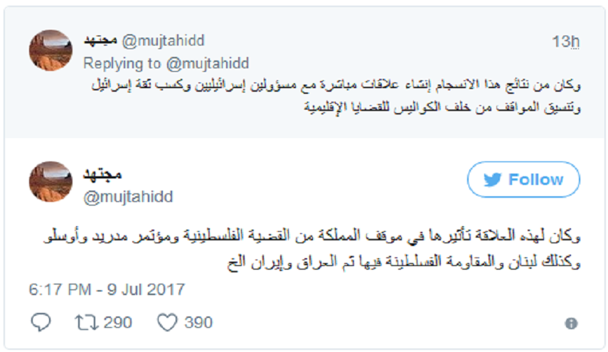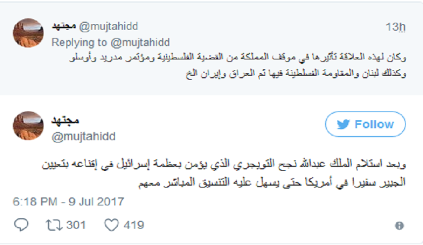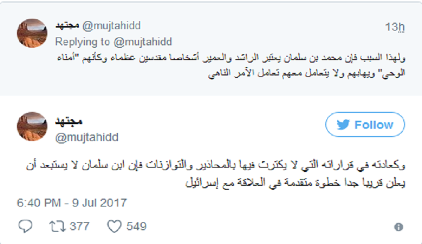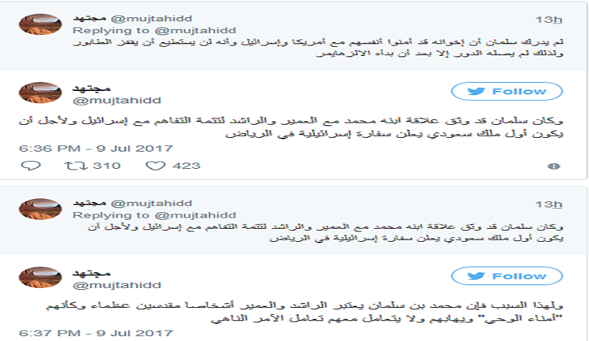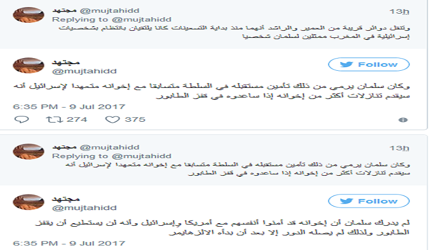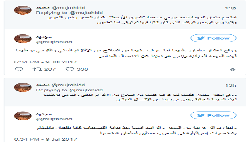 وتابع تغريداته “ووقع اختيار سلمان عليهما لما عرف عنهما من انسلاخ من الالتزام الديني والقومي يؤهلهما لهذه المهمة الخيانية ويبقى هو بعيدا عن الاتصال المباشر “, مشيراً إلى أن دوائر قريبة من العمير والراشد نقلت أنهما منذ بداية التسعينات كانا يلتقيان بانتظام بشخصيات إسرائيلية في المغرب ممثلين لسلمان شخصيا.