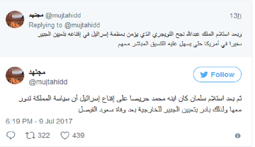 وواصل مجتهد شرح التفاصيل المخفية في العلاقة السعودية الاسرائيلية قائلاً ” وبعد استلام الملك عبدالله نجح التويجري الذي يؤمن بعظمة "إسرائيل" في إقناعه بتعيين الجبير سفيرا في أمريكا حتى يسهل عليه التنسيق المباشر معهم