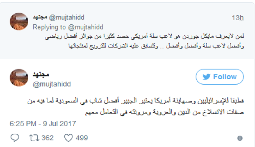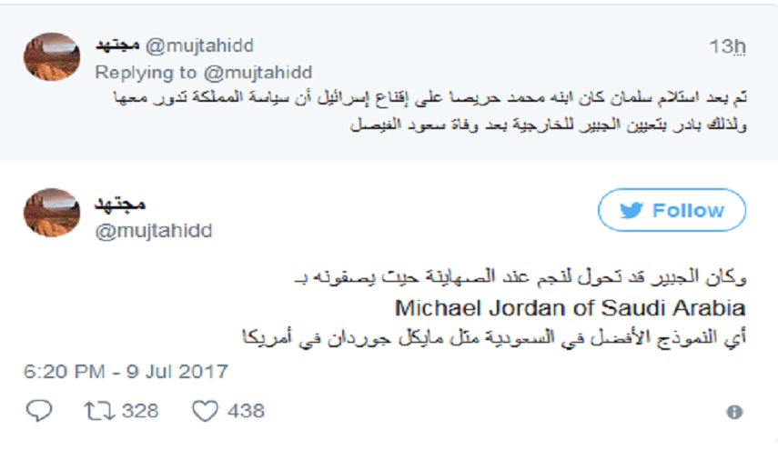 وأوضح مجتهد أن الجبير تحول لنجم عند الصهاينة حيث يصفونه بـ Michael Jordan of Saudi Arabia أي النموذج الأفضل في السعودية مثل مايكل جوردان في أمريكا.. مضيفا ” لمن لا يعرف مايكل جوردن هو لاعب سلة أمريكي حصد كثيرا من جوائز أفضل رياضي وأفضل لاعب سلة وأفضل وأفضل .. وتتسابق عليه الشركات للترويج لمنتجاتها “