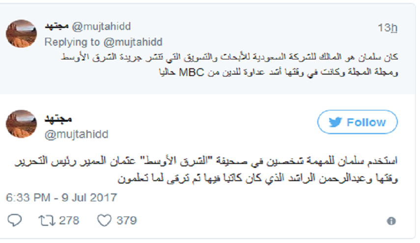 وأضاف ” كان سلمان هو المالك للشركة السعودية للأبحاث والتسويق التي تنشر جريدة الشرق الأوسط ومجلة المجلة وكانت في وقتها أشد عداوة للدين من MBC حاليا “.