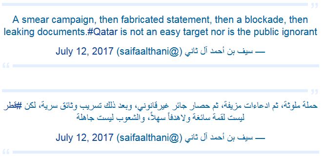 ولخص محطات الأزمة بين بلاده والدول المقاطعة، بقوله إنها "حملة ملوثة، ثم ادعاءات مزيفة، ثم حصار جائر غير قانوني، وبعد ذلك تسريب وثائق سرية. لكن قطر ليست لقمة سائغة ولا هدفا سهلاً، والشعوب ليست جاهلة".
