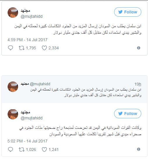 وقال "مجتهد" إن ولي العهد السعودي طلب من الخرطوم إرسال مزيد من الجنود، بعد الانتكاسات الكبيرة التي طالت بما يسمى بـ"التحالف العربي" في اليمن، وفق قوله.