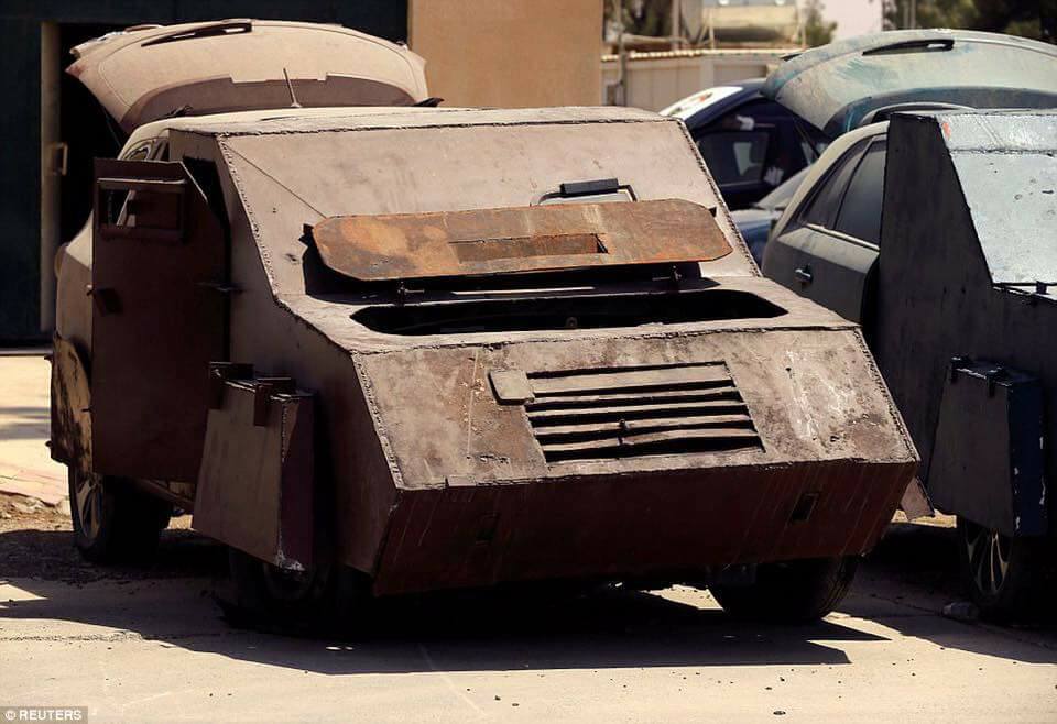 معظم سيارات داعش هي سيارات دفع رباعي تم استبدال الغلاف الخارجي بصفائح الحديد مما يجعلها تبدو وكأنها شيء من روبوت الحروب.