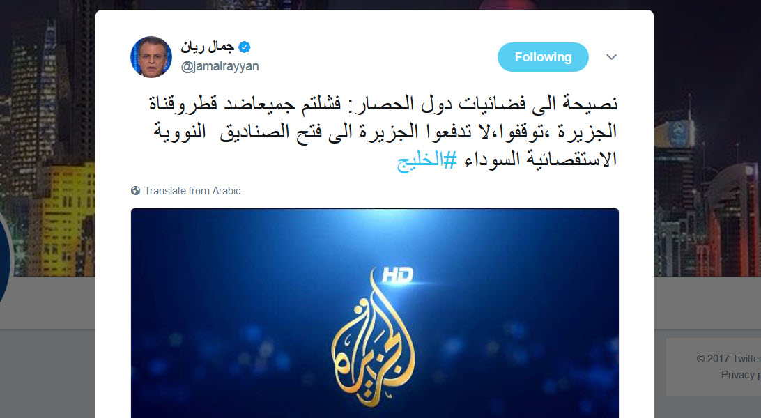 وكتب المذيع بقناة الجزيرة جمال ريان في تغريدة على حسابه بتويتر "نصيحة إلى فضائيات دول الحصار: فشلتم جميعا ضد قطر وقناة الجزيرة، توقفوا، لا تدفعوا الجزيرة إلى فتح الصناديق النووية الاستقصائية السوداء".