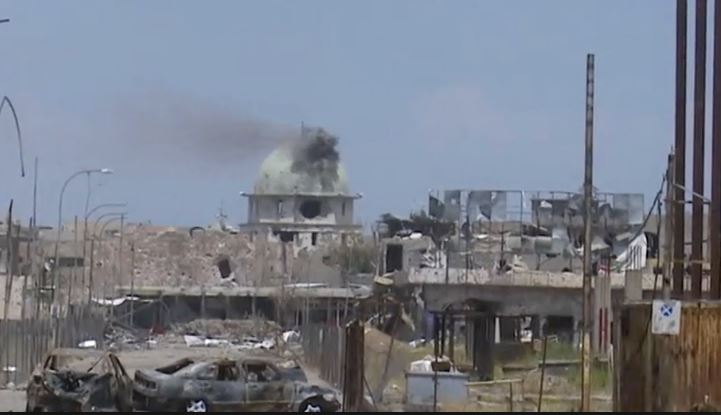 وبدا خلال المقطع، ما حدث للمسجد من الدمار جراء المعارك التي جرت في الموصل خلال الحرب الدائرة في المدينة، جعلت منها أطلالاً.