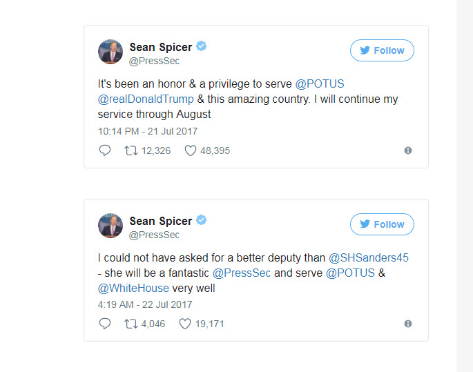 وغرد سبايسر في "تويتر": "أمريكا بلد عظيم"، وقال إنه يشعر بالفخر لخدمة الرئيس الأمريكي، وسيواصل عمله في هذه المهنة حتى نهاية الشهر المقبل، مشيدا في الوقت ذاته بسارة سانديريس، التي ستشغل مكانه.