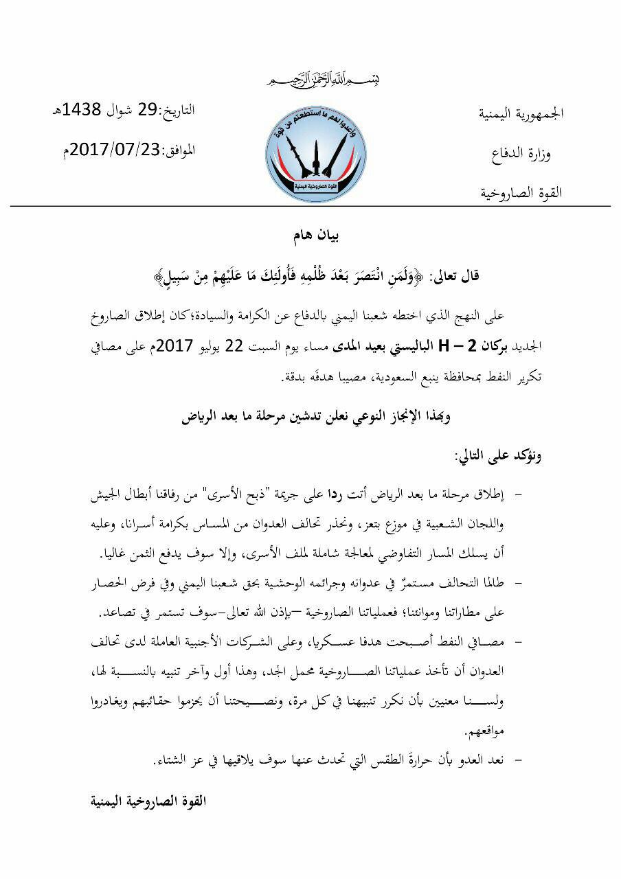 وقالت القوة الصاروخية اليمنية في بيان تلقت "قناة الكوثر" نسخة منه، "إن إطلاق مرحلة ما بعد الرياض تأتي ردا على جريمة ذبح الأسرى في موزع بتعز. وأضافت: نحذر تحالف العدوان من المساس بكرامة أسرانا، كما ان عملياتنا الصاروخية سوف تستمر في تصاعد ردا على استمرار العدوان والحصار. ونوهت القوة الصاروخية الى ان مصافي النفط أصبحت هدفا عسكريا، مضيفة: "نصيحتنا للشركات الأجنبية العاملة لدى تحالف العدوان أن تحزم حقائبها وتغادر مواقعها". وقالت القوة الصاروخية: نعِد العدو بأن حرارةَ الطقس التي تحدث عنها سوف يلاقيها في عز الشتاء.