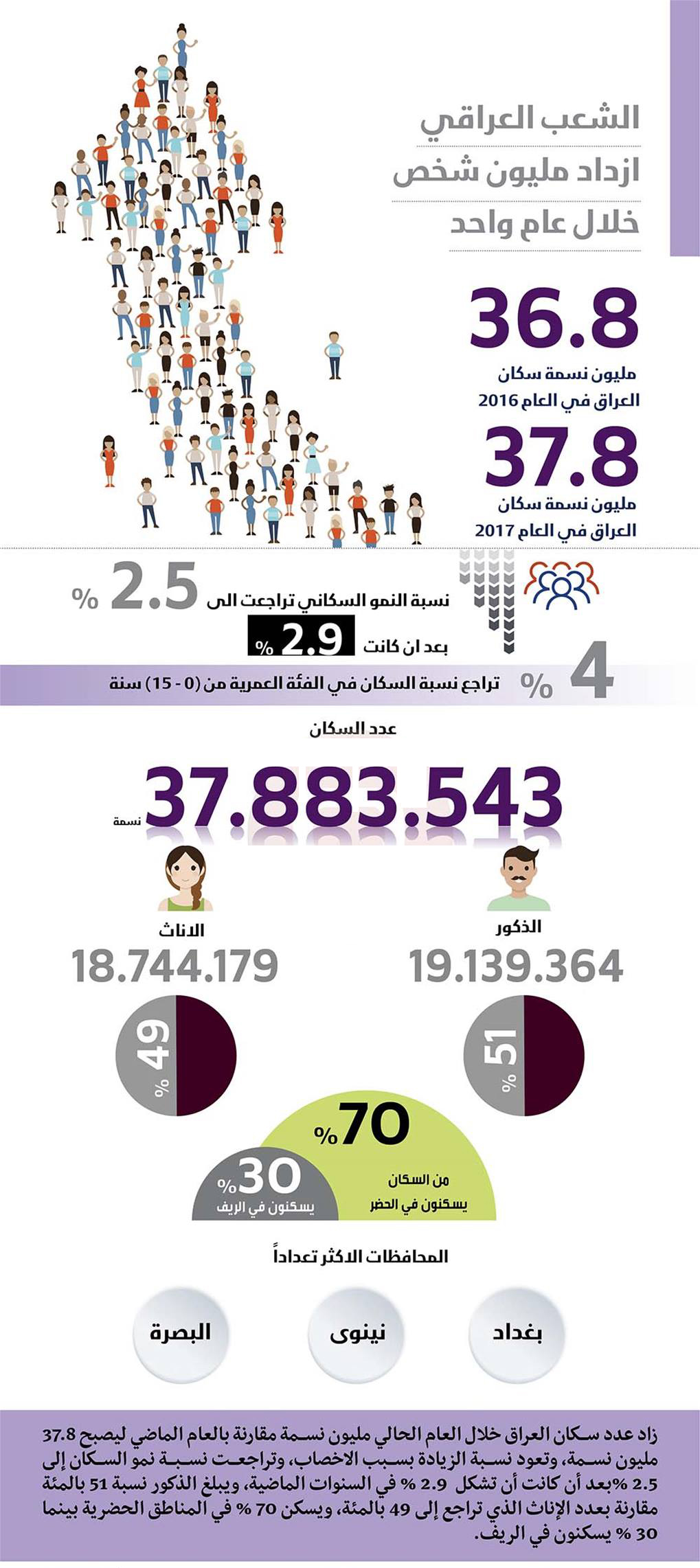 زاد عدد سكان العراق خلال العام الحالي مليون نسمة مقارنة بالعام الماضي ليصبح 37.8 مليون نسمة، وتعود نسبة الزيادة بسبب الاخصاب، وتراجعـــت نسبـــة نمو الســـكان إلى 2.5 %بعد أن كانت أن تشكل 2.9 % في السنوات الماضية، ويبلغ الذكور نسبة 51 بالمئة مقارنة بعدد الإناث الذي تراجع إلى 49 بالمئة، ويسكن 70 % في المناطق الحضرية بينما 30 % يسكنون في الريف
