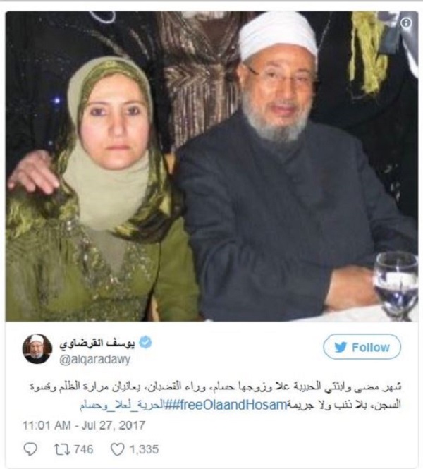 وقال "القرضاوي" في تدوينات له عبر حسابه بموقع التدوين المصغر "تويتر": "شهر مضى وابنتي الحبيبة علا وزوجها حسام، وراء القضبان، يعانيان مرارة الظلم وقسوة السجن، بلا ذنب ولا جريمة #الحرية_لعلا_وحسام #freeOlaandHosam" ، حسب قوله.