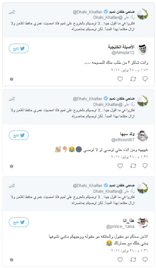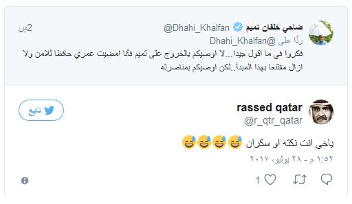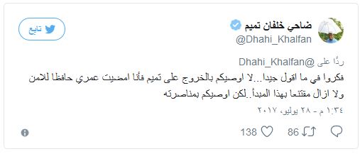 وقال خلفان في تدوينة له عبر حسابه بموقع التدوين المصغر "تويتر" موجها حديثه للشعب القطري:"فكروا في ما اقول جيدا…لا اوصيكم بالخروج على تميم فأنا امضيت عمري حافظا للامن ولا ازال مقتنعا بهذا المبدأ..لكن اوصيكم بمناصرته".