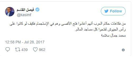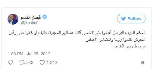 وفي السياق ذاته نقل "القاسم" عن أحد النشطاء في تغريدة سابقة ما نصه: "من فكاهات حكام العرب أنهم أعادوا فتح الأقصى وهم في الإستجمام فكيف لو كانوا على رأس الجيوش لفتحوا كل مساجد العالم".