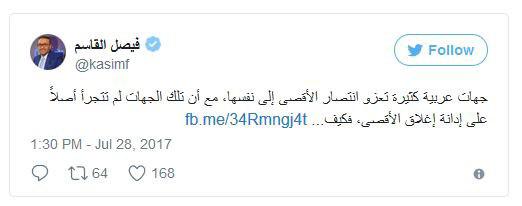 وتابع "جهات عربية كثيرة تعزو انتصار الأقصى إلى نفسها، مع أن تلك الجهات لم تتجرأ أصلاً على إدانة إغلاق الأقصى، فكيف تتجرأ على إجبار إسرائيل على فتحه"