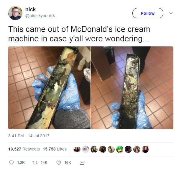 وادعى المستخدم أن الصور المثير للاشمئزاز تظهر حالة العفن داخل آلة "الآيس كريم"، ما أصاب المستخدمين بالصدمة، وأعيد تغريدها أكثر من 13 ألف مرة.