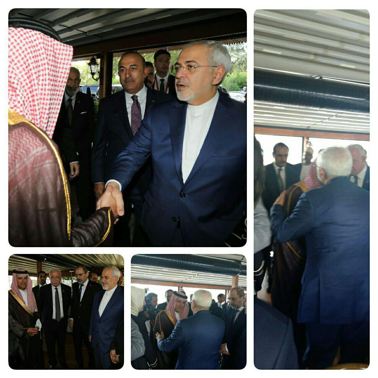 وعلى هامش الاجتماع قال ظريف لوسائل الاعلام ان مصافحته مع نظيرة السعودي تأتي وفقا لاحترام مبادئ العمل الدبلوماسي.
