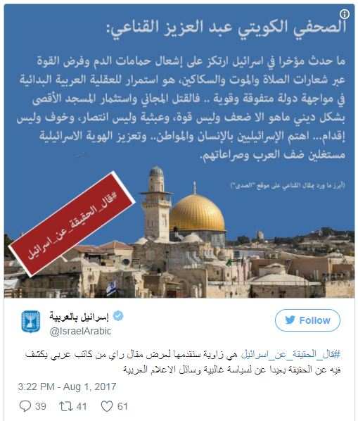 وكان الكاتب الكويتي قد قلل من الانتصار الذي حققه الفلسطينيون ومرابطي المسجد الأقصى وإجبار الكيان الإسرائيلي على إزالة البوابات الإلكترونية عن بوابات المسجد، مدافعا عن الكيان لكونه قد قام بتركيب بوابات حديثة.