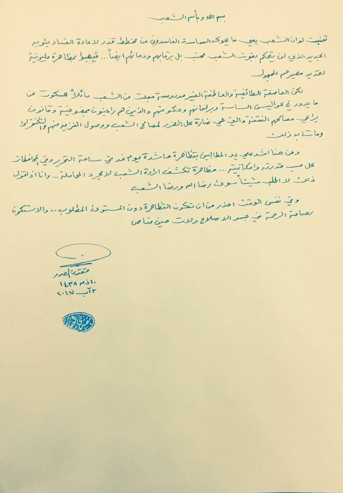 وقال الصدر في بيان: تمنيت لو ان الشعب يعي ما يحوكه الساسة الفاسدون من مخطط قذر لاعادة الفساد بثوبه الجديد الذي لن يتحكم بقوت الشعب فحسب بل برقابهم ودمائهم ايضاً... فيهبوا بمظاهرة مليونية لتحديد مصيرهم المجهول.