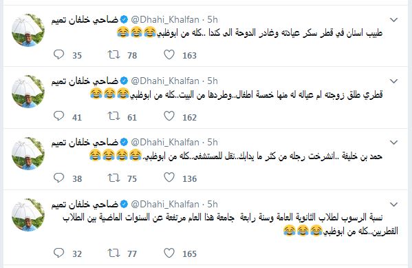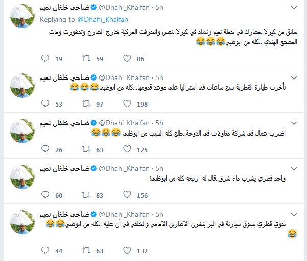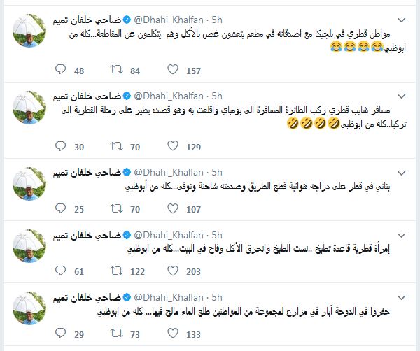 وحاول ضاحي خلفان من خلال تغريداته أن يسلط الضوء على أن كل ما يدور في قطر من أحداث، حتى البسيطة منها، يتم توجيه أصابع الاتهام فيه إلى الإمارات.