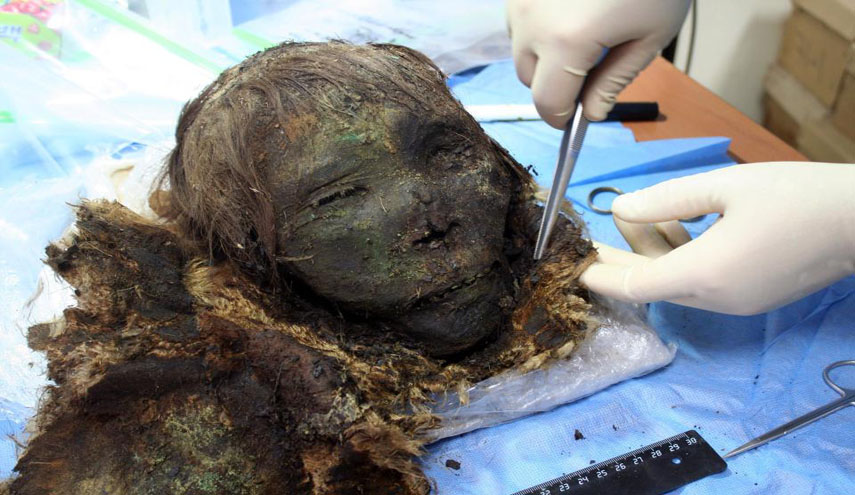 وظهر العلماء في الصور، وهم ينزعون من وجهها قطعة شبيهة بالقماش دفنت بها في أرض دائمة التثلج في القرن الثاني عشر في موقع دفن زيليني يار بالقرب من مدينة ساليخارد الروسية.