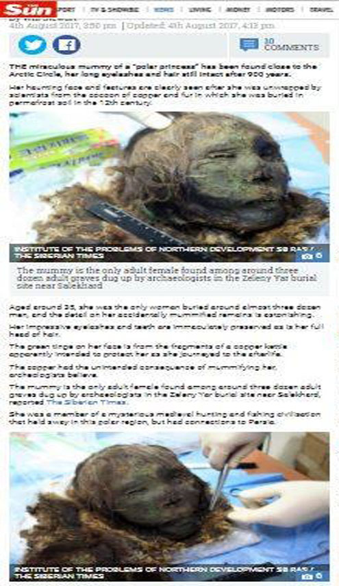 وقالت صحيفة "سيبيريان تايمز" أن المومياء هى الوحيدة التى عثر عليها بين حوالى ثلاثة عشر مقبرة للبالغين حفرها علماء الاثار فى موقع دفن زيلينى يار بالقرب من ساليخارد.