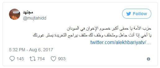 ورد “مجتهد” على حساب “الإخبارية”، مخاطبا إدارة القناة، بتغريدة قال فيها: “حزب الأمة يا حمقى أكبر خصوم الإخوان في السودان”.