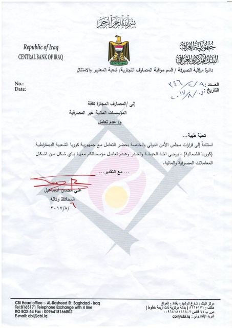 وقال البنك في بيان له، ان "على المصارف كافة والمؤسسات المالية غير المصرفية، اخذ الحيطة والحذر وعدم تعاملها مع كوريا الشمالية باي شكل من اشكال المعاملات المصرفية والمالية". واضاف البنك ان "ذلك ياتي استنادا الى قرارات مجلس الامن الدولي والخاصة بحظر التعامل مع جمهورية كوريا الشعبية الديمقراطية (كوريا الشمالية)". ووافق مجلس الأمن الدولي بالإجماع، في 5 اب 2017، على مشروع قرار أمريكي بفرض عقوبات جديدة على كوريا الشمالية، ردًّا على استمرار تجاربها الصاروخية الباليستية. السومرية نيوز