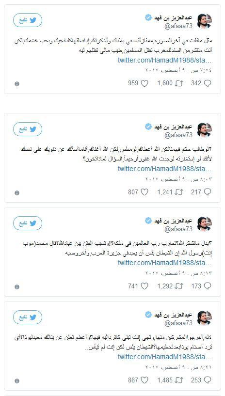 وأردف عبد العزيز قائلا: "بدل ما تشكر الله؟ تحارب رب العالمين في ملكه؟! وتسبب الفتن بين عباد الله؟ قال محمد (موب أنت) رسول الله إن الشيطان يئس أن يعبد في جزيرة العرب، وآخر وصيه له أخرجوا المشركين منها وتجي أنت تبني كاتدرائية فيها؟ وأعظم تعلن عن بنائك معبد لبوذا؟ أي ترد أصنام بوذا بعد تحطيمها؟ الشيطان يئس لكن أنت لم تيأس".