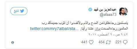 واختتم الأمير عبد العزيز بن فهد تغريداته بالقول: "يا مسلمين رجاء فكونا من المدح والذم ولا تفسدوا أن نتوب جميعا لله رب العالمين رجاء الصمت وإن عشنا رأينا".