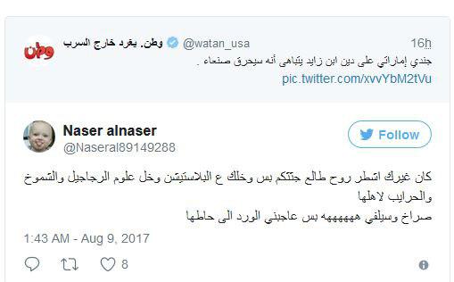 أما المغرد “مجد كنعان” رد قائلا: “كذاب ابووه عادحنا عنحرق لهم الإمارات بكل الشواذ الذي فيها”.