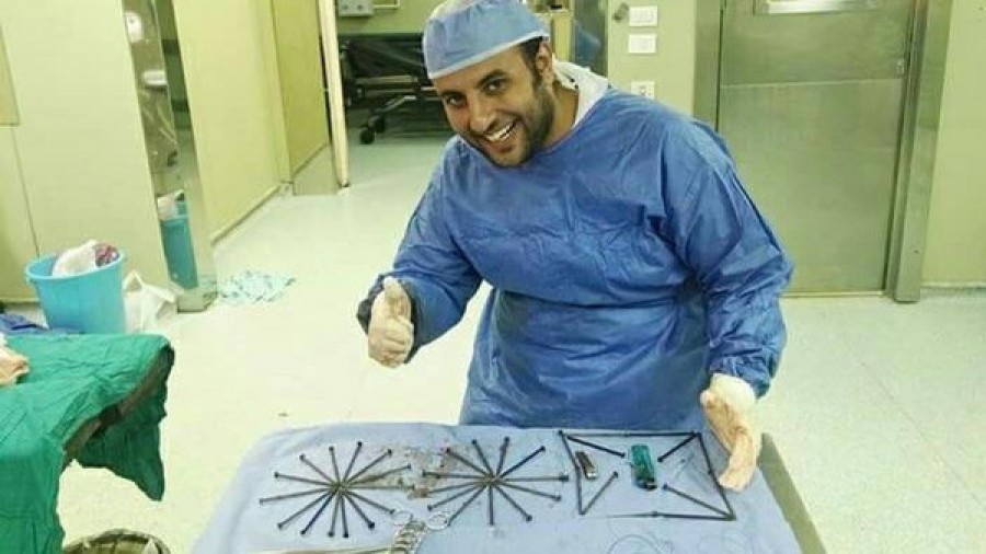 وأضاف أنه تم عمل أشعة للمريض، واكتشف بمعدته أشياء معدنية، ثم قام بعمل استكشاف وتبين وجود أشياء غريبة وغير متوقعة بمعدة المريض، وهي 39 مسماراً كبيراً وولاعة وقصاصة أظافر، ونجح في استخراجهم عبر عملية جراحية.
