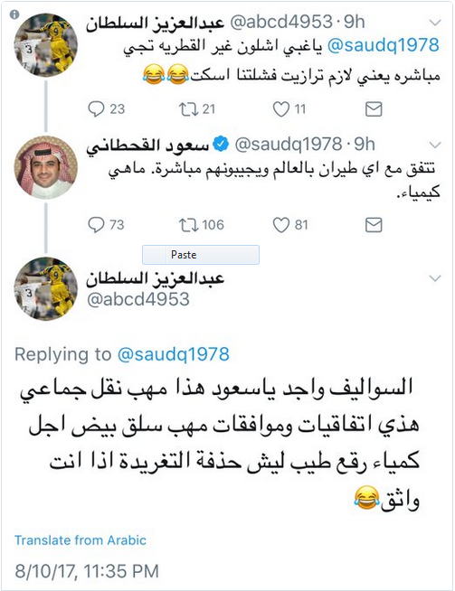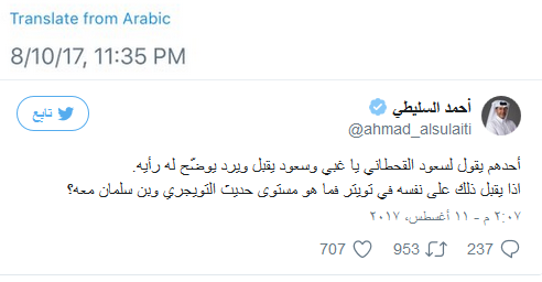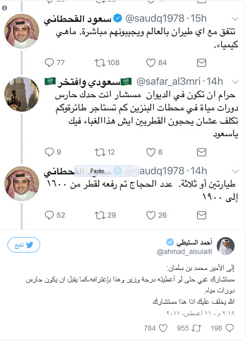 وقال “السليطي” في تدوينات له عبر حسابه بموقع التدوين المصغر “تويتر” رصدتها “وطن” تعليقا على مداخلات “القحطاني” مع المغردين حول منع السعودية للقطريين من أداء الحج: “إلى الأمير محمد بن سلمان: مستشارك غبي حتى لو أعطيته درجة وزير وهذا بإعترافه، كما يقبل ان يكون حارس دورات مياه. الله يخلف عليك اذا هذا مستشارك”.