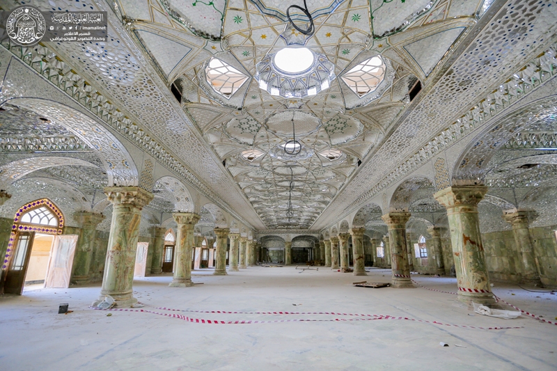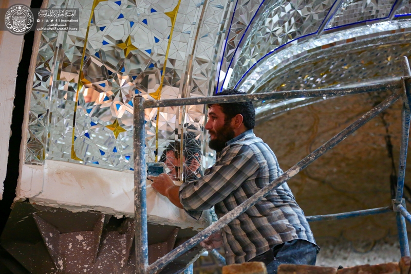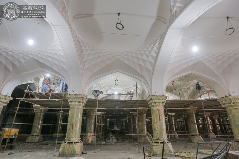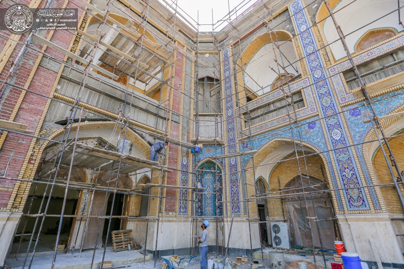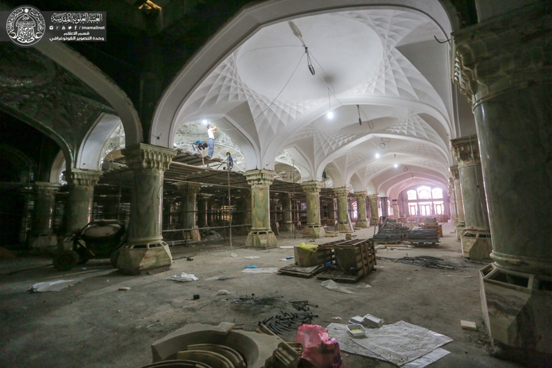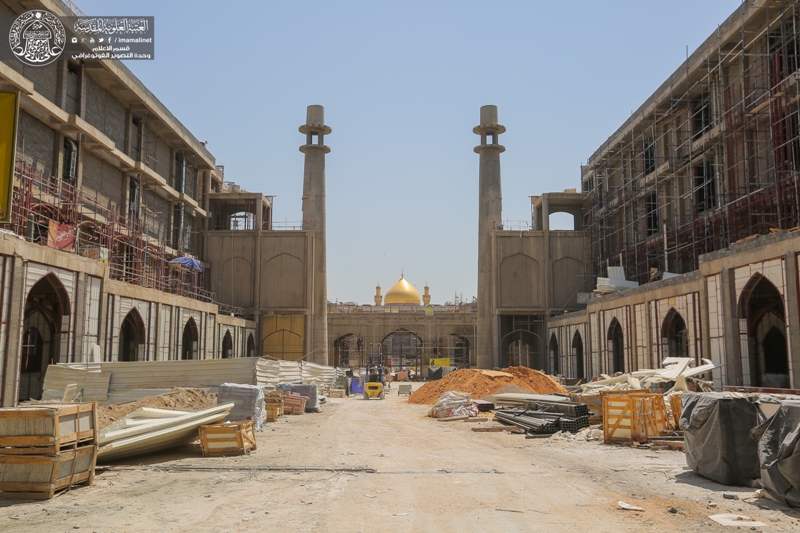 وتابع:" العمل يستمر في الواجهات الشمالية والجنوبية وبمسافة طولية تبلغ (200) متر طولا من الداخل والخارج، للمساحات المحيطة بجزء الزيارة والعبادة الذي تبلغ مساحته الكلية 32 ألف متر مربع لأربع طوابق كاملة".