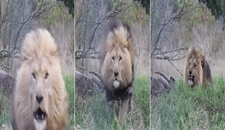 وقف الأسد، ونظر بعينين ثاقبتين، ثم انطلق بسرعة مخيفة، وعلى الرغم من إدراك المصورين ما سيقوم به، وعلى الرغم من السور الحديدي الذي يفصلهما عن الأسد، لكن انفجرت لحظة رعب من قلب الزئير والغبار، واهتزت الكاميرات حتى كادت تسقط مع القلوب التي انخلعت من أماكنها، ثم ثبت كل شيء وهدأ تمامًا.