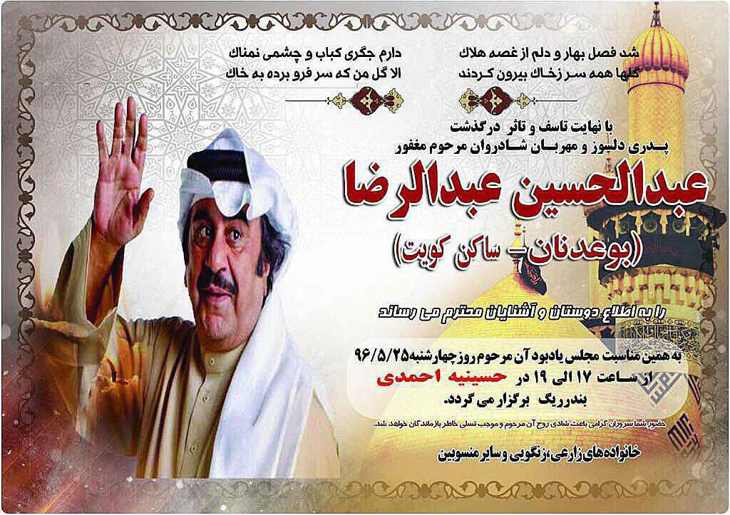 تناقلت مواقع التواصل الاجتماعي صورة لاعلان عن مراسم تابين للفنان الكويتي (من اصول ايرانية) عبد الحسين عبد الرضا في "ميناء ريغ" بمحافظة بوشهر (جنوب شرق ايران).