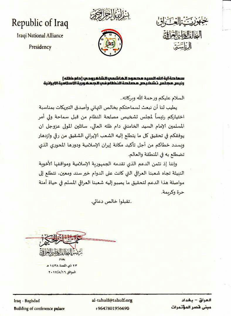 بعث رئيس التحالف الوطني العراقي السيد عمار الحكيم برقية تهنئة الى آية الله محمود هاشمي شاهرودي هناه فيها بمناسبة اختياره رئيسا لمجمع تشخيص مصلحة النظام في ايران.