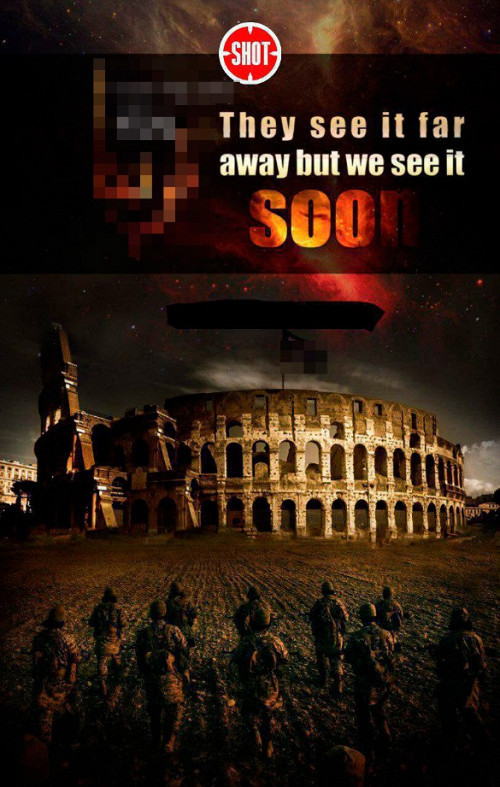 وتذيل هذه الصورة بعبارة: "يظن الجميع أن هذا لن يحدث، ولكننا سننفذه قريبا." ويشير التعليق على هذه الصورة المروّعة إلى أن "داعش" يتوعد بشن هجوم إرهابي جديد في إيطاليا.