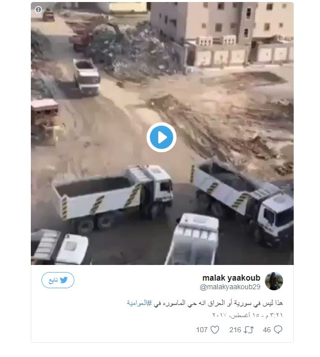 وكتب حساب باسم "ملاك يعقوب" على موقع التواصل الاجتماعي "تويتر" يقول: "هذا ليس في سوريا أو العراق إنه حي المسورة في العوامية".