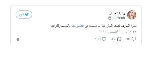 وكتبت رانيا العسال على "تويتر" أيضاً تقول: "قتلوا الشرف ليحيا العار هذا ما يحدث في العوامية باختصار".