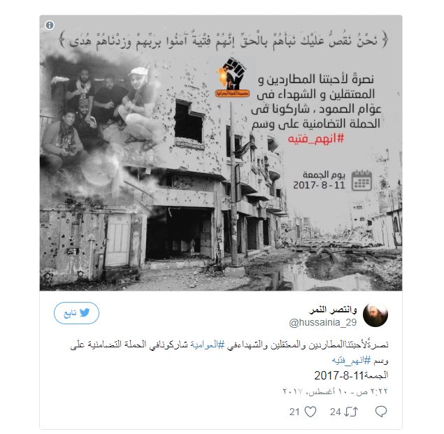 ونشر حساب باسم "انتصر النمر" رسالة تضامنية وصفها بأنها "نصرةً لأحبتنا المطاردين والمعتقلين والشهداء في العوامية". وقال "شاركونا في الحملة التضامنية على وسم #إنهم_فتية".