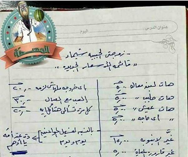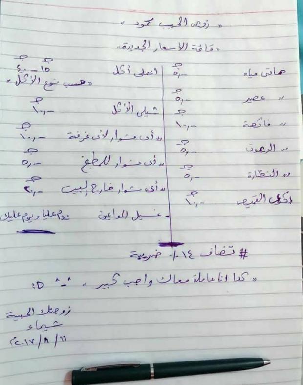 وتظهر صورة الورقة لسيدة تدعى "شيماء" لزوجها "محمود"، وتضمنت قائمة بأسعار الخدمة التي تقدمها إليه بشكل ساخر.