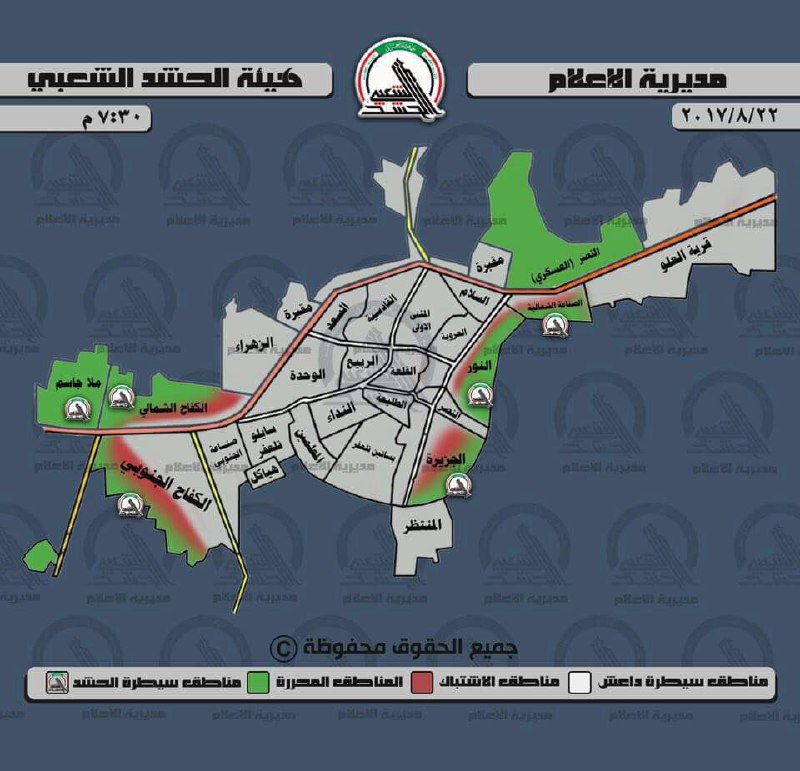 شرعت الفرق الهندسية و الجهد الهندسي للحشد الشعبي و القطعات الامنية بفتح السواتر الامامية في المحاور التي شهدت تقدم القطعات فيما واصلت تطهير المناطق المحررة الامس و اليوم من العبوات التي زرعها العدو في الطرق و المنازل.