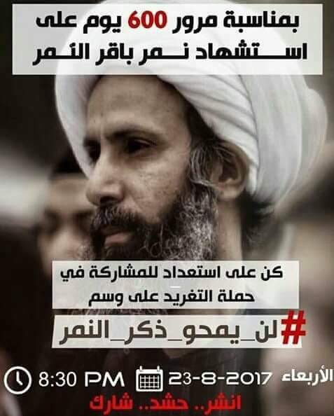 يستعد ناشطون سعوديون على موقع التواصل الاجتماعي "تويتر"، لإطلاق وسم يحمل عنوان " لن_يمحو_ذكر_النمر"، وذلك بمناسبة مرور 600 يوم على استشهاد عالم الدين السعودي آية الله الشيخ نمر باقر النمر. وتنطلق هذه الحملة اليوم الاربعاء 23-08-2017 في الساعة 8:30 عصرا بالتوقيت المحلي للسعودية، حيث دعا المغردون كافة الناشطين وحماة الشهيد النمر للاستعداد على المشاركة في حملة التغريد على وسم " لن يمحو ذكر النمر" في صفحات التواصل على موقع "تويتر". يذكر ان وزارة الداخلية السعودية اعلنت في كانون الثاني / يناير 2016، تنفيذ جريمة حكم الاعدام بحق آية الله الشيخ النمر و46 متهما آخرين بزعم تبني "أفكار متشددة" مما لاقى ادانة شديدة وواسعة من قبل منظمات حقوق الانسان. المصدر: قناة الغدير الفضائية