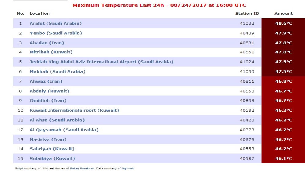 ونشرت محطة "بلاسيرفيلي" في كاليفورنيا الأمريكية، اليوم، جدولاً بأعلى درجات الحرارة على مستوى العالم.
