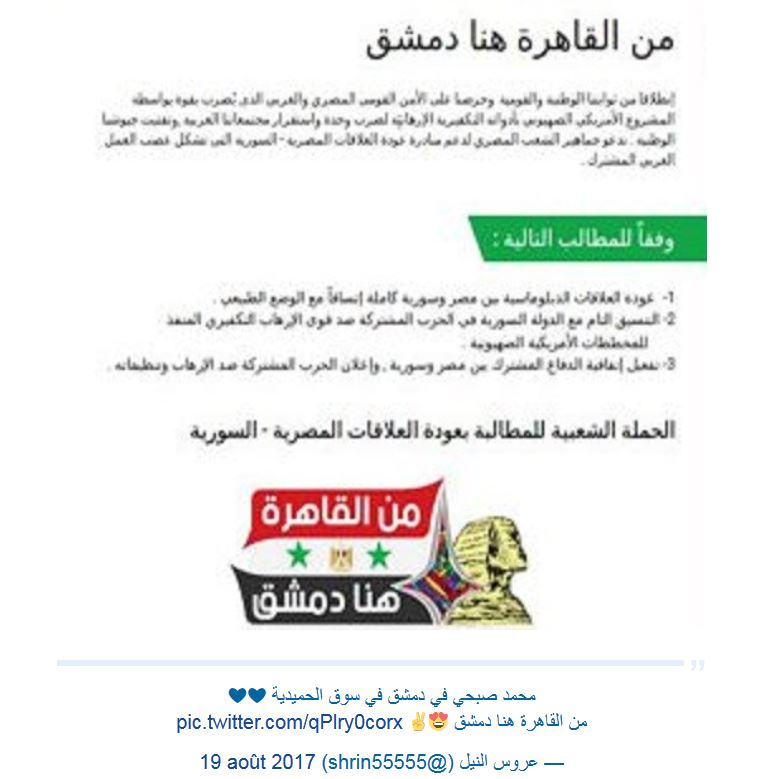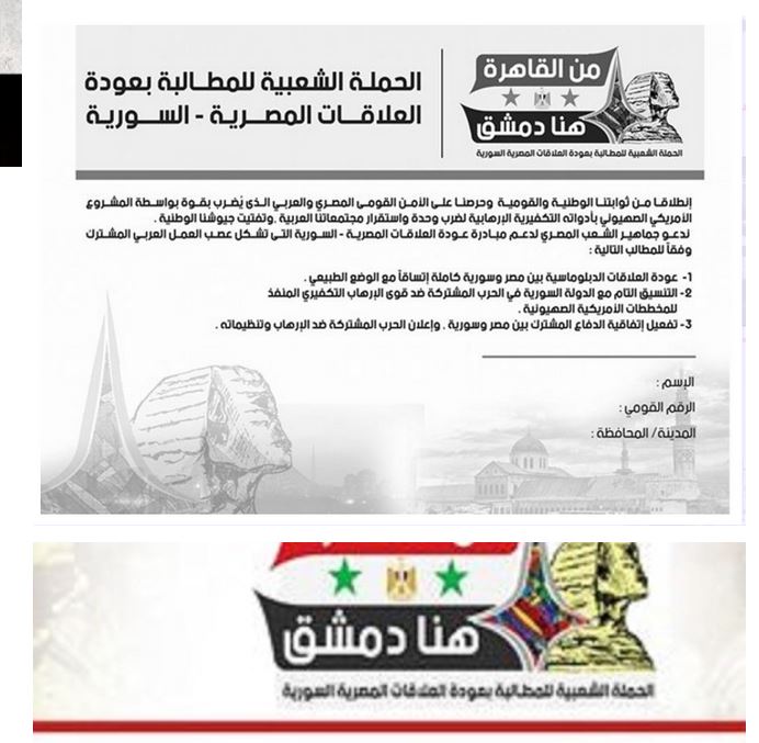 وجاء في عريضة التوقيع الإلكتروني: "انطلاقا من ثوابتنا الوطنية والقومية وحرصنا على الأمن القومي المصري والعربي، ندعو جماهير الشعب المصري، لدعم مبادرة عودة العلاقات المصرية السورية، التي تشكل عصب العمل العربي المشترك".