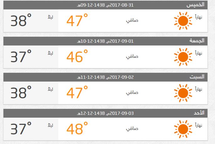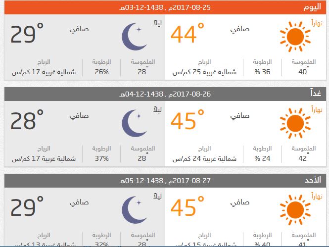 وذكرت الهيئة في نشرتها اليوم 25 آب 2017 أن "الطقس غداً السبت صحو حار في المناطق كافة، ودرجات الحرارة ترتفع عن اليوم السابق الذي بلغت فيه درجة الحرارة العظمى 45 مئوية، والرياح شمالية غربية خفيفة الى معتدلة السـرعة (10-20) كم/س ، ومدى الرؤية (8-10) كم".