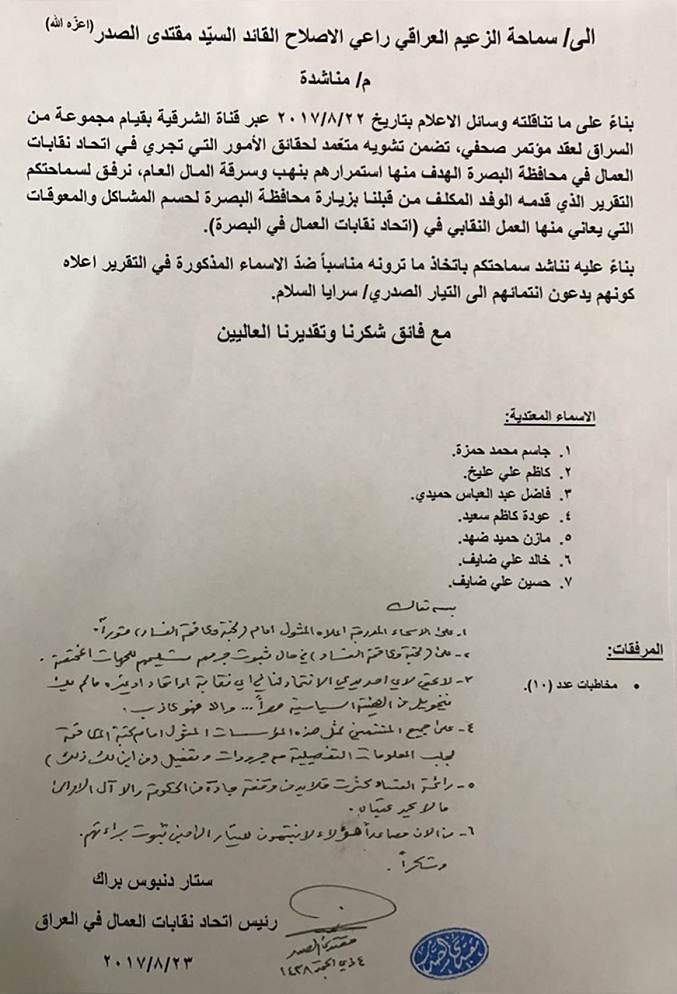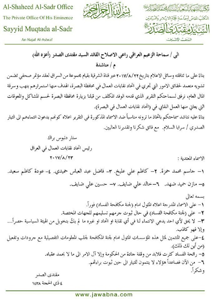 وقال الصدر في رد على مناشدة وجهت له من رئيس اتحادات نقابات العمال بالعراق ستار دنبوس وتضمنت "بناء على ما تناقلته وسائل الاعلام يوم 22 اب الحالي، بقيام مجموعة من السراق لعقد مؤتمر صحفي تضمن تشويه متعمد لحقائق الامور التي تجري في اتحاد نقابات العمال بالبصرة الهدف منها استمرارهم بنهب وسرقة المال العام، ونناشدكم باتخاذ ما ترونه مناسبا ضد الاسماء المذكورة (جاسم محمد حمزة، كاظم علي عليخ، فاضل عبد العباس، وعودة كاظم سعيد، ومازن حميد ضهد، وخالد علي ضايف، وحسين علي ضايف)"، وتلقت السومرية نيوز نسخة منه ان "على الاسماء المذكورة المثول امام لجنة مكافحة الفساد فورا".
