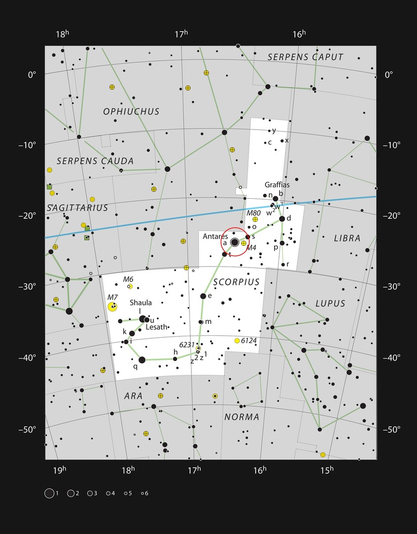 ويعرف الكوكب الأحمر العملاق أيضا باسم "كوكبة العقرب" Scorpius constellation، بسبب درجة لونه الوردي التي يمكن تمييزها بالعين المجردة.